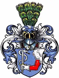 Blasonierung: In Blau ein aus dem linken Schildrand aus silbernen Wolken hervorwachsender, roter Arm mit silbernem Handschuh, der ein Schwert mit goldenem Griff trägt, um welches sich eine silberne Schlange windet. Auf dem blau-silbern bewulsteten Helm ein grüner Pfauenstoß. Die Helmdecken sind blau-silbern.[3]
