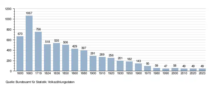 - ↑ Daten der Eidgenössischen Volkszählungen ab 1850 nach Gemeinden. (XLSX; 10 MB) Bundesamt für Statistik, Neuchâtel, 12. Juli 2024, abgerufen am 17. März 2025 (Öffnung in Excel nur über "Anhang/Excel-Datensatz" möglich).