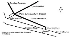Am Übergang des Canal du Midi in den Canal de Brienne beim Port de l’Embouchure wurden zwei Brücken über die beiden Kanäle errichtet, die sogenannten Ponts-Jumeaux.