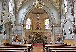 Die Kirche St. Petrus Canisius ist ein einschiffiger, neoromanischer Bau mit Dachreiter. Das Langhaus ist dreijochig mit Kreuzrippengewölbe. Daran schließt ein eingezogener, kurzer Polygonchor an. Das Aussehen des Innenraums wird von der historistischen Ausmalung der Erbauungszeit bestimmt.