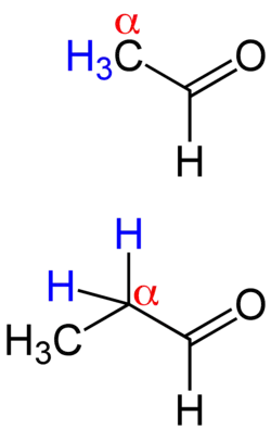 ![]() Aldehyde mit blau markierten Wasserstoffatomen am α-Kohlenstoffatom neben der Carbonylgruppe. Diese Aldehyde sind enolisierbar und reagieren unter alkalischen Bedingungen zu Aldolen, eine Cannizzaro-Reaktion läuft nicht ab. |
