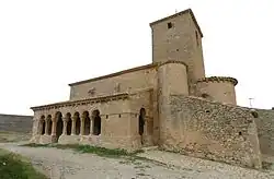 - Die einschiffige und nahezu fensterlose romanische Kirche San Pedro hat eine gut erhaltene Südvorhalle (portico oder galería porticada), wie sie im Norden Spaniens (Provinzen Burgos, Soria, aber auch in der Umgebung von Segovia) häufiger vorkommt. Der Zweck dieser Vorhallen ist letztlich unklar – Wetterschutz, Gebets- und Wandelgang bzw. repräsentativer Eingang zur Kirche und/oder hoheitliches Ambiente für einen Versammlungs- und Gerichtsplatz der männlichen Bevölkerung. Die asymmetrisch angelegte siebenbogige Vorhalle zeigt eine gedrehte Säule mit vier Schäften sowie Kapitelle, wie sie ganz ähnlich auch im Kreuzgang (claustro) des etwa 70 km (Luftlinie) nördlich gelegenen Klosters Santo Domingo de Silos vorkommt; ein weiterer Bogen befindet sich an der östlichen Schmalseite der Vorhalle. Der Glockenturm der Kirche erhebt sich über einem Vorchorjoch unmittelbar vor der Apsis und wird begleitet von einem runden Treppenturm auf seiner Südseite.[7]