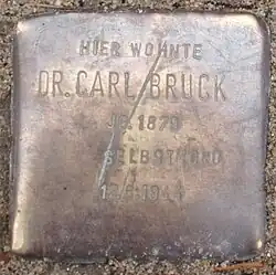 Als Folge der nationalsozialistischen Rassengesetze und der antisemitischen Verfolgung war er wiederholt Repressionen ausgesetzt und verlor im Jahr 1935 seine Stelle.[3] Um der bevorstehenden Deportation durch die Nationalsozialisten ins Konzentrationslager zu entgehen, nahm er sich das Leben durch die Einnahme von Zyankali, als die Gestapo versuchte, ihn zu verhaften.[3] Anlass der versuchten Verhaftung war die Aussage eines Molkereigehilfen, der in Potsdam festgenommen worden war und bei dem 51 Stück Butter gefunden wurden. Der Molkereigehilfe gab im Verhör an, diese Butter – wie auch schon vorherige Lieferungen – an Carl Bruck übergeben zu wollen, was dazu führte, dass dieser in seiner Villa in der Hamburger Elbchaussee aufgesucht wurde. Bruck bat darum, in die Küche gehen zu dürfen, um ein Glas Wasser zu trinken. Als er zurückkam, legte er sich auf ein Sofa und starb. In der Küche wurde ein Fläschchen mit der Aufschrift „Kalium cyanatum“ sichergestellt.[6] Seine Frau tötete sich drei Tage später selbst durch die Einnahme einer Überdosis von Schlafmitteln.[1]