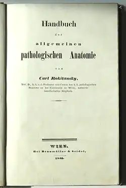 Seine Forschungsergebnisse dokumentierte Rokitansky in seinem dreibändigen Handbuch der pathologischen Anatomie. Es wurde 1842–46 von dem Verlag Braumüller&Seidel publiziert. Darin beschrieb er die Erkrankungen jedes einzelnen Organs, systematisch und erklärte, anhand welcher Merkmale diese Erkrankungen diagnostiziert werden konnten. Die 3. Auflage (1855–1861) enthält Holzschnittdrucke seiner handgezeichneten Präparate, die er 550-facher Vergrößerung anfertigte.[14]