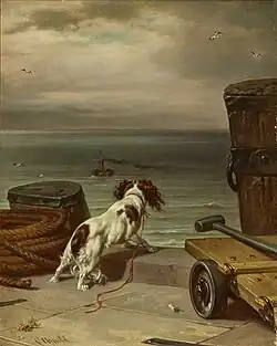 - „Ein Spaniel an der Mole“, Öl/Lwd., 59 × 47 cm (Kunsthandel)