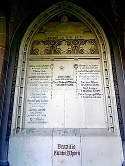 Carl Rhoen, der seit 1847 mit Josefine, geborene Hartmann (1824–1890) verheiratet war, litt sehr unter ihrem Tod im Jahre 1890. Rhoen, seit 1886 wohnhaft am Aachener Boxgraben, verstarb im Mai 1899. Von seinen insgesamt sieben Kindern überlebten ihn nur zwei Söhne und eine Tochter[2]. Er selbst fand seine letzte Ruhestätte im Campo Santo auf dem Westfriedhof II in Aachen.