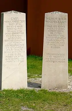 Von Spandau aus wurde Ossietzky am 6. April 1933 in das neu errichtete Konzentrationslager Sonnenburg bei Küstrin verschleppt. Dort wurde er ebenso wie die anderen Häftlinge schwer misshandelt. Die Zustände in dem anfänglich von der SA geführten Lager führten schließlich dazu, dass die SS unter Heinrich Himmler im Frühjahr 1934 das Lagersystem „professionalisierte“. Ossietzky wurde mit weiteren bekannten Häftlingen von Sonnenburg in das KZ Esterwegen im nördlichen Emsland verlegt. Dort wurden die Gefangenen unter unerträglichen Bedingungen bei der Trockenlegung der emsländischen Hochmoore eingesetzt. Ende 1934 wurde der völlig abgemagerte Ossietzky in das Krankenrevier verlegt. Dem Bericht eines Mithäftlings zufolge sollte Ossietzky im Krankenlager durch Spritzen ermordet werden. Ob Ossietzky, wie der Häftling behauptet, tatsächlich Tuberkulose-Bazillen injiziert wurden, ist nicht zweifelsfrei erwiesen.[10] Im Herbst 1935 besuchte der Schweizer Diplomat Carl Jacob Burckhardt als Mitglied des Internationalen Komitees vom Roten Kreuz das KZ Esterwegen. Dabei gelang es ihm, auch Ossietzky zu treffen, den er anschließend als ein „zitterndes, totenblasses Etwas, ein Wesen, das gefühllos zu sein schien, ein Auge verschwollen, die Zähne anscheinend eingeschlagen“ beschrieb. Ossietzky sagte zu Burckhardt: