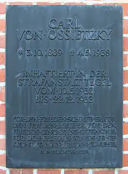 Als Herausgeber der Zeitschrift Die Weltbühne musste sich Ossietzky mehrfach wegen Artikeln, die illegale Zustände in der Weimarer Republik zum Thema hatten, vor Gericht verantworten. Im international aufsehenerregenden Weltbühne-Prozess wurde er 1931 wegen Spionage verurteilt, weil seine Zeitschrift auf die verbotene Aufrüstung der Reichswehr aufmerksam gemacht hatte. Kurz nach seiner Entlassung kamen die Nazis an die Macht. Ossietzky wurde am 28. Februar 1933 in die sogenannte Schutzhaft genommen. Als einer der prominentesten politischen Häftlinge wurde Ossietzky unter anderem im KZ Esterwegen besonderes Opfer nationalsozialistischer Willkür. Er wurde häufig misshandelt und gefoltert. 1936 erhielt Ossietzky in einer internationalen Hilfskampagne den Friedensnobelpreis. Im gleichen Jahr wurde er, durch die Torturen schwer erkrankt, unter Polizeiüberwachung in ein Berliner Krankenhaus verlegt. Dort starb er unter Bewachung zwei Jahre später.