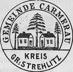 Das alte Siegel der Gemeinde Gräflich Carmerau (Kreis Groß Strehlitz) zeigt zwei Häuser und links, rechts und dazwischen je eine Fichte. Das Siegel der Gemeinde Königlich Carmerau (Kreis Oppeln) zeigt eine Justitia.