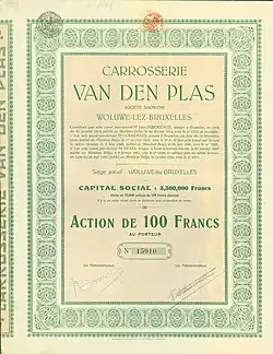 1870 wurde der Betrieb als Stellmacherei unter der Bezeichnung Van den Plas oder Van der Plas in Brüssel gegründet. Später stellte man neben Wagenrädern auch Teile von Achsen her. 14 Jahre später zog die Firma nach Antwerpen um und beschäftigte sich von da an auch mit Wagnerei. Der Stellmacherbetrieb stellte komplette Kutschen her. 1890 kam eine zweite Werkstatt am alten Standort Brüssel dazu. Die Fuhrwerke dieser Marke waren in Belgien und darüber hinaus als von besonders hoher Qualität bekannt.