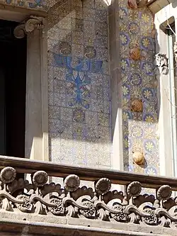 Die beiden Seitenportale besitzen eingedrückte konvexe Bögen, die von weiteren Spitzbögen gekrönt werden, die von einem Mittelpfeiler mit einem pflanzlichen Kapitell getragen werden. Diese Mittelpfeiler dienen gleichzeitig als Basis für die großen Konsolen, die die Steinplatten der Tribünen der Seitenkörper stützen. Diese beiden Tribünen sind durch den großen Balkon entlang des Hauptgeschosses miteinander verbunden. Dieser ist mit einem Steingeländer geschmückt, dessen Gestaltung auf ineinander verschlungenen Sonnenblumenstängeln basiert. Vom Hauptgeschoss aufwärts zeigen sich die Wände mit glasierten Keramikfliesen in Blau- und Goldtönen bedeckt, deren Motive blaue Adler, verschiedene Blumen und eingestreute geprägte Halbkugel zeigen. Das Hauptgeschoss öffnet sich zur Straße mittels einer Galerie von Schiebefenstern, die von acht Säulen mit ionischen Kapitellen und kannelierten Schäften getragen wird, welche mit verschiedenen Pflanzen- und Blumenreliefs belegt sind. Die Seitenkörper besitzen zwei sich über zwei Etagen erstreckende Erker in Form halber Oktogone, welche von Steinsäulen mit ionischen Kapitellen eingerahmt sind.