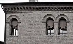Eine der ästhetischen Merkmale ist die Ausführung der Fenster. Einige davon simulieren Doppelfenster, ein optischer Trick, der es bereits in der venezianischen Architektur der Zeit gebraucht wurde, der aber in diesem Falle überarbeitet und verändert wurde. Kein einziges der scheinbaren Doppelfenster ist echt, da die beiden benachbarten Öffnungen im Inneren stets verschiedenen Räumen zugeordnet sind; sie sind liegen jeweils in der Nähe der Trennwand und schaffen so in den Räumen eine besondere Belichtung.[1]