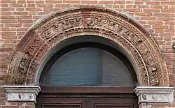 Die kleinen Bögen der Fenster und noch mehr der Bogen der Eingangstüre, die in Terrakotta ausgeführt sind, sind extrem raffiniert. Über dem Eingang stellen die Elemente des Bogens Seepferdchen, Muscheln, Engel und – in der Mitte – das Gesicht eines alten Mannes dar.[2]