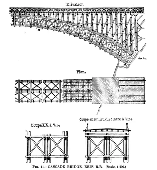 Die 1832 gegründete New York and Erie Rail Road sollte New York City mit dem Eriesee verbinden, wozu eine Verbindung zwischen Piermont und Dunkirk entlang der Südgrenze des Bundesstaates New York geplant war. Die Bauarbeiten starteten 1836. In den folgenden 15 Jahren wurden einzelne Teilabschnitte in Betrieb genommen, die sich schließlich 1851 zu der Gesamtstrecke aufsummierten. Die Erweiterung nach Jersey City erfolgte ein Jahr später durch die Übernahme der Paterson and Hudson River Railroad.[1] Da das Gelände durch die nördlichen Ausläufer des Appalachen-Plateau geprägt ist, waren zahlreiche Tunnel, Brücken und tiefe Einschnitte nötig. Auf dem Abschnitt von Port Jervis nach Binghamton musste die Strecke zudem geländebedingt für einige Kilometer durch Pennsylvania verlegt werden. Hier entstanden östlich des Susquehanna River, dem der Streckenverlauf hier folgt, mit dem Starrucca Viaduct und der Cascade Bridge zwei der imposantesten Bauwerke in der Nähe von Lanesboro. Für die Überquerung des namensgebenden Cascade Creek wählte John Fowler eine Holz-Bogenbrücke in Fachwerkbauweise, die das Gleis in über 50 Meter Höhe über die Schlucht führte. Mit 84 Metern hatte sie die größte Spannweite einer Eisenbahnbrücke aus Holz und wurde später nie übertroffen; nur einige wenige hölzerne Straßen- oder Fußgängerbrücken erreichten bis zu 110 Meter.[2]