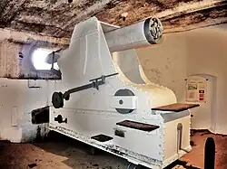 - Der Verschlussblock für die Geschützpforte war in einem Schacht aufgehängt und wurde durch einen Kettenzug mit zwei Handkurbeln auf und ab bewegt. Diese Handkurbeln befanden sich in zwei Aussparungen seitlich des Geschützraumes. Zum Ausgleich diente ein Kontergewicht von 7 t. Um Schießunfälle zu vermeiden, war das Rohr bei verschlossener Klappe durch eine von einer Batterie gespeiste elektrische Sperre am Vorlauf in die Schussposition gehindert.