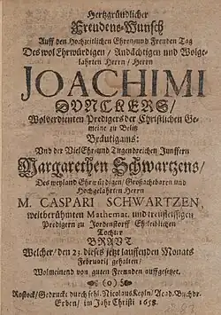 - ↑ hier wird er bezeichnet als: „M. CASPARI SCHWARTZEN, weitberühmten Mathematiker und treufleissigen Prediger zu Jördenstorff“