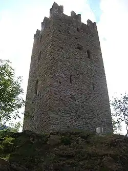 Der Burgturm existiert heute noch; es ist der alte Bergfried aus dem 12. Jahrhundert. Er ist etwa 15 Meter hoch und ist von Rundzinnen gekrönt. In der Vergangenheit hatte der Turm auch ein Holzschindeldach.[1] Die Eingangstüre war, wie es bei einfachen, mittelalterlichen Burgen im Aostatal üblich war, aus Gründen der besseren Verteidigbarkeit erhöht angebracht, in diesem Falle 4 Meter über dem Erdboden, erreichbar nur über eine Leiter, die bei einem Angriff abgenommen werden konnte.[2] Der Turm hat einen quadratischen Grundriss mit einer Seitenlänge von 6,4 Metern.