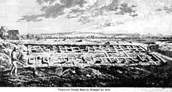 Vermutlich noch im Jahr 70 begann der Wiederaufbau in Stein.[40] Die Bauarbeiten wurden im Jahr 79 abgeschlossen.[41] In seinen Steinbauphasen hatte das Legionslager einen nahezu quadratischen Grundriss von 528 m mal 524 m, womit es eine Gesamtfläche von 27,67 Hektar bedeckte und damit das größte Einzellegionslager des Imperiums war. Seine Dimensionen waren zur Unterbringung einer Legion und zweier Auxilia geschaffen worden, einer Ala (Eskadron der Kavallerie neben der regulären, 120 Mann starken Legionsreiterei) und einer Kohorte (Infanteriebataillon), also für insgesamt rund 7000 Mann. In der ersten und zweiten Steinbauphase folgte die Innenaufteilung einem festen Schema: durch die Via principalis in Praetentura (vorderer Lagerteil) und Retentura (rückwärtiger Lagerteil) aufgegliedert, gab es für diese Lagerteile jeweils drei durch parallel zur Via principalis verlaufende Lagerwege voneinander getrennte, sogenannte Scamna (Singular Scamnum = Bebauungsstreifen).[42]