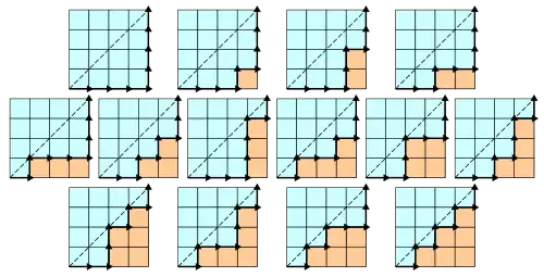 - monotonen Pfade entlang der Ränder eines Quadratgitters mit quadratischen Zellen, die keinen Punkt oberhalb der Diagonale enthalten. Ein monotoner Pfad beginnt in der unteren linken Ecke, endet in der oberen rechten Ecke und besteht vollständig aus Kanten, die nach rechts oder oben zeigen. Die 14 monotonen Pfade für sind:[13]
