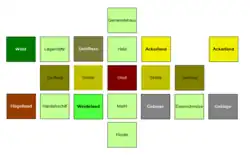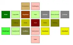 - Im Einführungsspiel spielen die Spieler mit einem im Regelheft vorgegebenen Startaufbau und ziehen ihre Starthandkarten „blind“ von einem Stapel. Erst im Themenspiel dürfen sich die Spieler die Starthandkarten aussuchen und danach ihre Landschaften so arrangieren wie es ihnen am sinnvollsten erscheint.