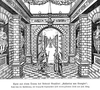| Ort und Zeit der Handlung: | Das Trauerspiel beginnet vor Auffgang der Sonnen / vnd endet sich mit dem Tage. Der Schauplatz ist die Königliche Hoffhaltung zu Schiras in Persen. Die gantze Handelung bildet ab den letzten Lebens-Tag der Königin Catharine. |