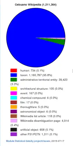 Eine Auswertung der ceb.wikipedia-Inhalte auf Wikidata im Juli 2015 ergab, dass von den damals 1,21 Millionen Artikeln 95,8 % Lebewesen und biologische Arten darstellen (1.160.787) und 3,3 % Städte und Gemeinden (39.420).[18]