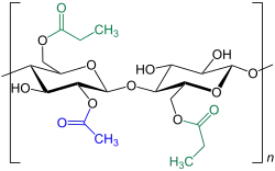 Celluloseacetatpropionat (CAP) ist ein Biopolymer, das auf Cellulose basiert.[1] Es ist wie Celluloseacetat und Cellulosepropionat ein Ester der Cellulose mit aliphatischen Carbonsäuren. Während bei Celluloseacetat die Veresterung nur durch Essigsäure stattfindet, beträgt hier der Essigsäureanteil rund ein Drittel, zwei Drittel stellt gebundene Propionsäure dar.