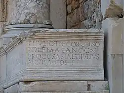 - ↑ Josef Keil: Bibliothek und Heroon. In: Wilhelm Wilberg u. a.: Die Bibliothek. (= Forschungen in Ephesos Bd. 5, 1), 1953, S. 81 Inschrift Nr. 13, Zeile 3 f.