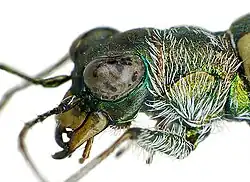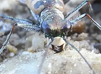 Der Kopf fällt durch die stark hervortretenden Augen auf, die dem Tier ein weites Gesichtsfeld eröffnen. Die Mundwerkzeuge sind schräg nach vorne unten gerichtet. Die weiße Oberlippe ist auffallend groß und mit nur wenigen Haaren am Vorderrand versehen (Abb. 2). In der Mitte ihres Vorderrandes sitzt ein nach vorne gerichteter Zahn. Die Oberkiefer sind dunkel, an der Wurzel hell, spitz ausgezogen und auf der Innenseite mit drei scharfen Zähnen ausgestattet. Die elfgliedrigen Fühler sind vor den Augen über der Basis der Oberkiefer eingelenkt. Die ersten vier Glieder sind metallisch glänzend, die folgenden durch feine Behaarung matt erscheinend. Das erste Fühlerglied ist mit mehreren Borsten besetzt (Abb. 5). Außer den viergliedrigen Lippentastern (Abb. 6, rechts blau nachgezogen) und den ebenfalls viergliedrigen Kiefertastern (Abb. 6, rechts grün) ist die Außenlade des Unterkiefers noch zu einem zweigliedrigen Kiefertaster umgebildet (Abb. 6, rechts gelb). Alle Taster sind schmal und lang, gelb oder braungelb; ihr Endglied ist dunkler gefärbt, aber nicht metallisch grünblau. Die Wangen sind kahl (Abb. 5).