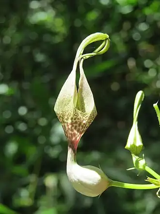 Der Blütenstand ist wenigblütig und besitzt einen 2 cm langen, behaarten oder auch glatten Stiel. Sie setzen lateral zwischen den Blattknoten an. Die Tragblätter sind klein lanzettlich und kahl. Die steifen Blütenstiele sind 2 bis 2,5 cm lang. Die linealischen Kelchblätter sind 7 mm lang. Die zwittrigen, zygomorphen Blüten sind fünfzählig und mit einer doppelten Blütenhülle versehen. Die fünf Kronblätter sind im unteren Teil zu einer außen glatten Kronröhre (Sympetalie) verwachsen. Die Blütenkrone ist insgesamt bis zu 7,5 cm lang und blass violett-purpurfarben. Der untere Teil der Kronröhre ist aufgebläht, der mittlere Teil eingeengt und der obere Teil trichterförmig erweitert und gefleckt. Die Kronblattzipfel sind dreieckig-eiförmig und 3,5 cm lang. Sie sind mit den Enden verwachsen und bilden eine käfigartige Struktur. Die Lamina sind zurückgebogen, matt pinkfarben mit purpurfarbenen Flecken. Die Nebenkrone hat einen Durchmesser von 6 mm. Die Zipfel der äußeren interstaminalen Nebenkrone sind dreieckig, mittig eingeschnitten und behaart. Die Zipfel der inneren staminalen Nebenkrone sind 2,5 mm lang und kahl. Sie neigen sich über dem Gynostegium zusammen.