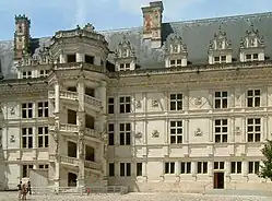 Der dreigeschossige Renaissanceflügel Franz’ I. zeigt auf der Hofseite einen großen offenen Wendelstein, eines der letzten bedeutenden Exemplare eines außerhalb des eigentlichen Gebäudekorpus befindlichen Treppenhauses. Die Fassade wirkt durch die Position der Wendeltreppe asymmetrisch, denn durch den Abriss des westlichen Gebäudeteils steht der achteckige Treppenturm nicht mehr exakt in der Mitte der Mauer. Seine steinernen Balustraden in Form der Symbole Franz’ I. sind nicht die Handläufe der Treppe, wie es auf den ersten Blick scheint, sondern die Brüstungen von Balkonen, von denen Schauspiele im Schlosshof beobachtet werden konnten. Ebenso wie die Brüstungen sind die Eckpfeiler der Treppe innen und außen reich verziert und besitzen im unteren Bereich Nischen, in denen Statuen stehen. Diese sind wie das Reiterstandbild im Flügel Ludwigs XII. eine Kopie der Originale, die im 19. Jahrhundert von Émile Seurre angefertigt wurden. Ebenerdig finden sich in einer großen Nische links neben dem Treppeneingang die Initialen F und C (für Franz und Claude), die Franz’ Emblem – den Salamander – einrahmen.