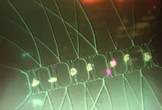Sie besitzen eine aus Kieselsäure bestehende Zellwand (Frustel, englisch frustule),[10] von der aus lange, dünne Fortsätze (sog. Setae, „Stacheln“ oder „Borsten“) sich nach außen erstrecken.[9]