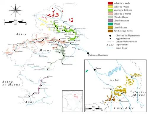 Das Anbaugebiet hat etwa 34.000 Hektar in fünf Départements: Marne, Aube, Aisne, Haute-Marne und Seine-et-Marne, wobei in den beiden letzteren nur sehr kleine Rebflächen liegen. Im Jahr 2002 waren 32.710 ha bestockt, von diesen standen 30.891 ha im Ertrag. Eine Ausweitung des Anbaugebietes auf 357 Gemeinden wurde beschlossen.[1] Die Festlegung der zugelassenen Parzellen war für das Jahr 2015 geplant, Champagner-Trauben können dort seit 2017 gelesen werden.[2] 'Blaupause' für die Ausweitung war die AOC-Zulassung von 30 Hektar in der Gemeinde Fontaine-sur-Ay im Jahr 1995 nach dreizehnjährigem Rechtsstreit.[3]