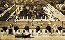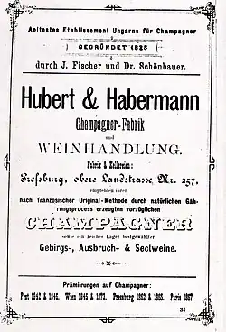 Im Jahre 1877[5] ging dann die Firma in den Besitz von Hubert[6] und Habermann („Hubert & Habermann Champagner-Fabrik und Weinhandlung“) über. Nach dem frühen Tode von Johann Evangelist im Jahre 1882[7] wurde die Firma von dessen Witwe Pauline Hubert geb. Habermann (* 1857, † 1925) fortgeführt. Das Produktionsgebäude stand auf der Landstraße (N° 257) in Preßburg und wurde in den 1960er Jahren abgerissen (heute steht auf dieser Stelle das Hochhaus der Technischen Universität). In den 1860er Jahren wurden hier etwa 120 000 Flaschen Sekt/Jahr produziert. Die aus Österreich stammende Familie Hubert[8] stellte u. a. auch die bekannte Sektmarke „Hubert Gentry Club“ her, die im Jahre 1896 bei der Millenniumsausstellung[9] in Budapest die goldene Medaille erhielt. Da die Marke „Gentry Club“ zu den Lieblingsmarken von Kaiser Franz-Joseph gehörte, besuchte er persönlich den Hubert-Pavillon bei der Millenniumsausstellung. Für die Firma war das damals ein riesiger Erfolg. Ein beträchtlicher Teil (70 bis 80 %) der Jahresproduktion[10] wurde ins Ausland exportiert und erhielt zahlreiche nationale, sowie internationale Auszeichnungen.[1]
