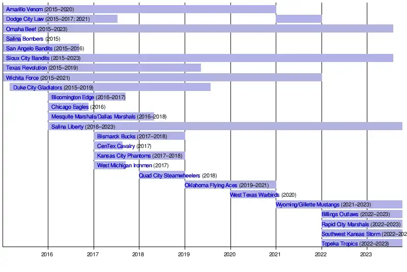 Teilnehmende Mannschaften (14): Sioux City Bandits, Dodge City Law, Omaha Beef, Amarillo Venom, Texas Revolution, Wichita Force, Duke City Gladiators, Bloomington Edge, Salina Liberty, Dallas Marshals, Bismarck Bucks, CenTex Cavalry, Kansas City Phantoms, West Michigan Ironmen