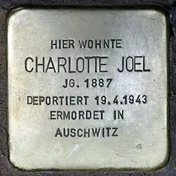 - ↑ Joel, Charlotte. [hier mit Angabe des Geburtsjahres 1887] stolpersteine-berlin.de; Koordinierungsstelle Stolpersteine Berlin; abgerufen am 11. Oktober 2018.