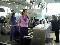 Zur Überprüfung der Identität des Passagiers und seines Tickets stehen dem Abfertigungspersonal Computer zur Verfügung, die mit dem Datenrechner der jeweiligen Fluggesellschaft verbunden sind.