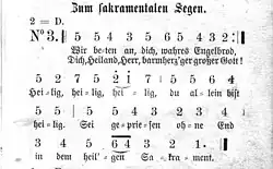 Melodien werden nach der Chevé'schen Ziffern-Notation nicht durch Noten, sondern durch Ziffern in der Folge von 1 bis 8 dargestellt. Bei Halbtonschritten aufwärts ist die Ziffer mit einem von links unten nach rechts oben führenden Strich versehen, bei Halbtonschritten abwärts mit einem von links oben nach rechts unten führenden Strich. Die Ziffern von 1 bis 8 stellen die Töne der Oktave von c‘ bis c‘‘ dar, die Töne der nächsthöheren Oktave werden durch Punkte über den Ziffern dargestellt, tiefere Oktaven analog dazu mit Punkten unter den Ziffern. Die Tonart eines Musikstückes ergibt sich aus einer vorangestellten Angabe (zum Beispiel 2 = d‘).
