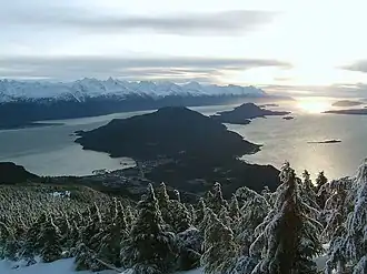 ![]() Blick von den Takshanuk Mountains auf die Chilkat-Halbinsel, links im Vordergrund Haines, im Hintergrund die Boundary Ranges | ||