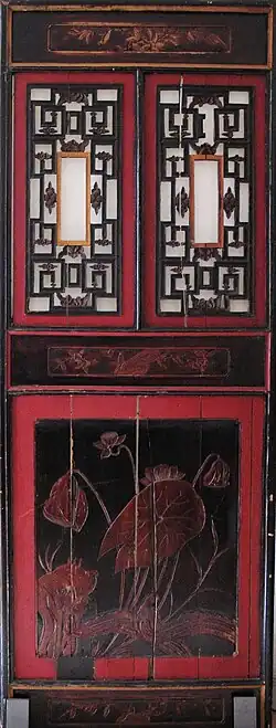 Eine chinesische Holztür oder ein chinesisches Holzfenster besteht aus unterschiedlich ausgeführten Teilen, von oben nach unten meist zuerst aus einer bandförmigen Holzplatte (chin.: yaoban), darunter dem eigentlichen langgestreckten Gitter (chin.: geyan), darunter wiederum einer Platte, oft gefolgt von einer „Schürze“ (chin.: qunban), ebenfalls aus Holz, und abschließend ganz unten wiederum einer Holzplatte. Hölzerne Bauelemente, die geöffnet werden konnten, nannte man auch „Trenntür“ (chin.: geshan, engl.: partition door). Die chinesischen Bezeichnungen der Konstruktionsdetails wurden vielfach im Laufe der Zeit – von Dynastie zu Dynastie – gewandelt, womit auch den stilistischen Wandlungen und wechselnden Gewichtungen Rechnung getragen worden ist.