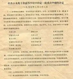 Die Universität war zunächst in den Räumen der Zentralen Parteihochschule der Kommunistischen Partei Chinas im nordwestlichen Stadtbezirk Haidian von Peking untergebracht.[9] Als das Zentralkomitee der KPCh am 22. März 1959 die 16 besten Universitäten des Landes zu Nationalen Schwerpunkthochschulen (全国重点大学) ernannte, war die Chinesische Universität für Wissenschaft und Technik eine davon. Qian Xuesens ursprünglicher Gedanke von der „sozialistischen Universität“ wurde sehr ernst genommen. So aßen die Dozenten das gleiche Essen wie die Studenten, Guo Moruo spendete von den Einnahmen aus seinen Werken 20.000 Yuan für einen Fonds für Kleidung und Bettdecken armer Studenten, Qian Xuesen spendete 11.500 Yuan für Unterrichtsmaterial.[10] Zur Einordnung: Qian Xuesen erhielt damals zusätzlich zu einer kostenlosen Dreizimmerwohnung ein Monatsgehalt von 335 Yuan, Arbeiter im Raum Peking verdienten je nach Qualifikation zwischen 35 und 112 Yuan pro Monat.[11]