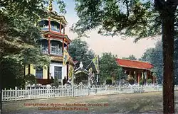 Der Chinesische Pavillon wurde anlässlich der Ersten Internationalen Hygiene-Ausstellung in Dresden 1911 als Ausstellungspavillon des damaligen chinesischen Kaiserreichs im Auftrag der kaiserlichen chinesischen Regierung errichtet.[1] Zimmerleute aus Shanghai bauten die traditionelle chinesische Hallenkonstruktion zunächst in China auf; anschließend wurde der Pavillon in Einzelteile zerlegt, nach Dresden verschifft und von Dresdner Bauarbeitern dort wieder aufgestellt.[2] Auf dem Ausstellungsgelände stand links neben dem Pavillon eine dreigeschossige Pagode, von der jedoch nichts mehr erhalten ist.[2] Nach Ende der Ausstellung ließ die chinesische Regierung den Pavillon samt Innenausstattung als Gastgeschenk in Dresden zurück.[2] Während einige Exponate in die Sammlung des Museums für Völkerkunde Dresden übergingen, kaufte noch im November 1911 die selbstständige Gemeinde Weißer Hirsch das Gebäude für 8500 Mark[2] (nach anderen Quellen 7000 Mark[3]). Unter der Leitung des Architekten Max Müller wurde der Pavillon im Rathausgarten der Gemeinde wieder aufgestellt.[3] Aufgrund der örtlichen Gegebenheiten wurde der ursprünglich eingeschossige Pavillon auf ein Untergeschoss aufgesockelt.[2]