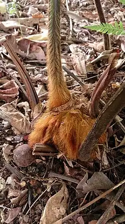 Cibotium barometz wächst baumförmig, mit holzigem, dickem Rhizom, das von langen braunen Haaren bedeckt ist.
