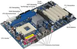 PC-Hauptplatine von 2005 mit North- und Southbridge und entsprechend weniger „diskreten“ Logikbausteinen