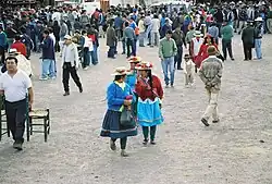 Die Männer benutzen dieselbe Hutform, aber höchstens mit der roten Cantuta geschmückt, und ¾-lange Wollhosen. Beide Geschlechter trugen erdbraune Ponchos aus Schafswolle mit Längsstreifen in verschiedenen hellen Brauntönen und Sandalen aus Leder, später aus Autoreifen. Heute sieht man die Hüte nur noch bei den Älteren, Blüten nur bei aus kleinen Dörfern Zugezogenen, die auch an der anderen Form der Kopfbedeckung zu erkennen sind. Die traditionellen bunten Röcke werden, wie auch die Zöpfe von den Frauen, kaum noch getragen.