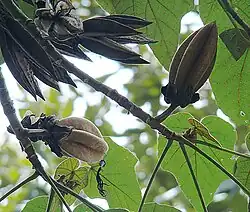 Es werden eiförmige, fünfrippige, -klappige, behaarte und bräunliche, vielsamige, lokulizidale, etwa 10–15 Zentimeter lange, harte, holzige, spitze Kapselfrüchte mit beständigem Kelch gebildet. Die kleinen, schwarzen, ledrigen, eiförmigen bis ellipsoiden und glänzenden Samen besitzen eine kleine, orange Strophiole.