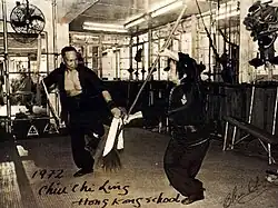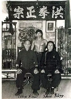 - ↑ Das Schild mit der chinesischen Aufschrift Hung Quan Zhengzong (洪拳正宗, Hóng Quán Zhèngzōng, Jyutping Hung4kyun4 Zing3zung1 – „Originales Hung Kuen“) im Bildhintergrund bedeutet etwa „originale Kampfkunst der Hung-Schule“ und wird in der historische Schreibrichtung von rechts nach links gelesen.