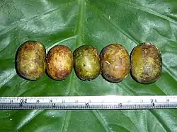 Die bei einer Länge von 2,5 bis 3 Zentimeter relativ kleinen und eiförmigen bis ellipsoiden Steinfrüchte sind dünnfleischig, bei Reife gelblich bis gelblich-grün und bräunlich gesprenkelt. Der glatte und leicht grubige, hell-braune, holzige Steinkern besitzt kleine Keimdeckel (Operculum).