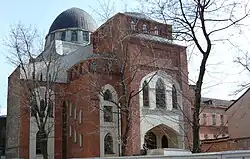 Die Synagoge gehört zu den Bauten des Historismus und vermischt Elemente von Neugotik und der orientalisierenden Architektur, so dass sie am ehesten eklektizistisch genannt werden kann. Die Grundfläche soll mehr als 2000 m² betragen, so dass in der Andachtshalle zirka 1000 Menschen Platz finden.[1][2] Diese Angaben – und die Einordnung als zweitgrößte Synagoge Europas nach der Großen Synagoge in Budapest – sind aber umstritten. Die Kuppelhöhe beträgt 42 Meter.[6]