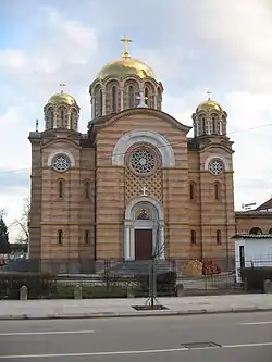 Der Bau auf dem freien Gelände, neben dem zukünftigen Rathaus der Stadt am Car-Dušan-Platz sollte die feste Einheit der Serbisch-orthodoxen Kirche mit dem damaligen Staat repräsentieren.
